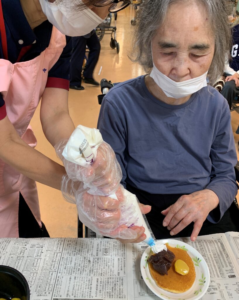 生地は職員が焼き、栗や生クリーム、餡子などの盛り付けを利用者さんにお願いしました。
