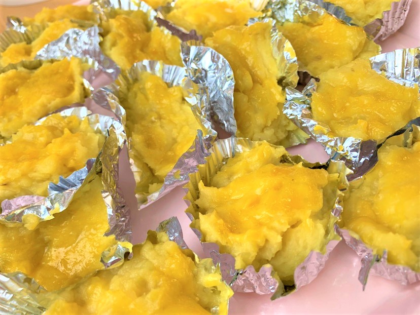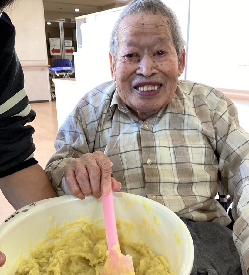 利用者さんは蒸かしたさつま芋を潰したり、材料を混ぜたり、スイートポテトの俵型に形成したりと、それぞれ役割をもって調理しました。