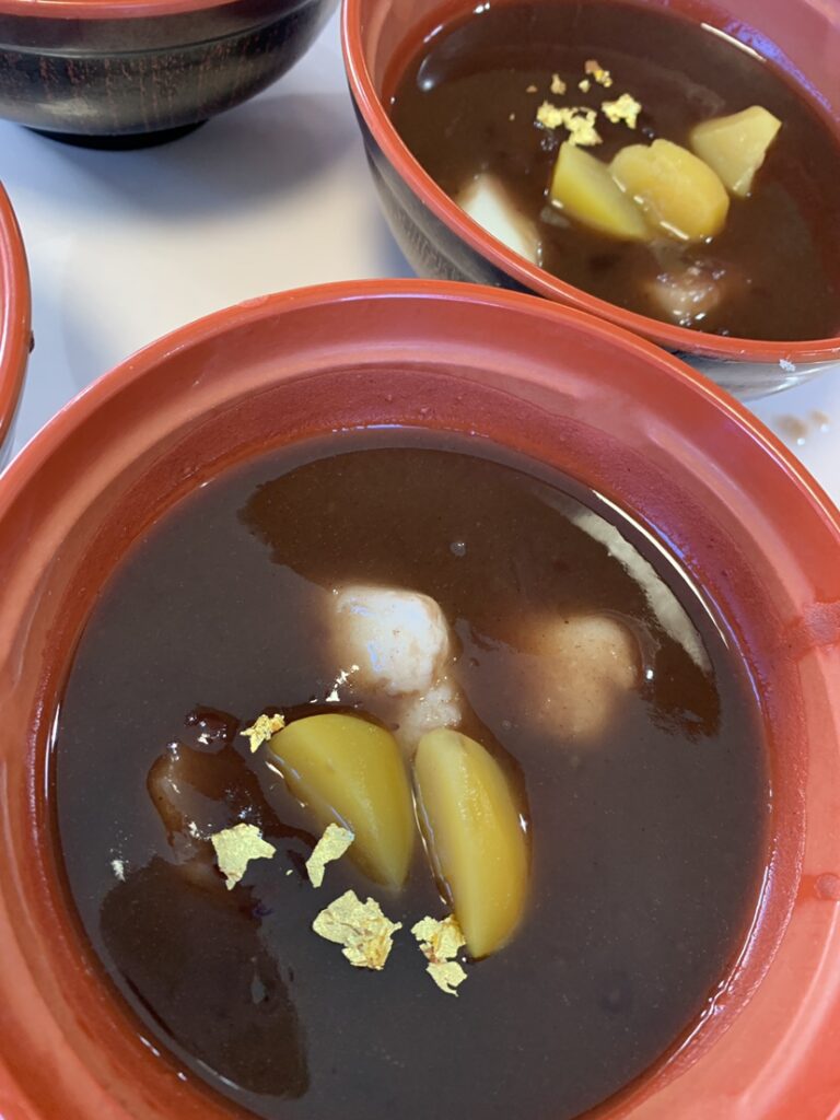 ぜんざいの上には栗と金箔の盛り付けを行い、新年のお祝いとして華やかに飾りました。