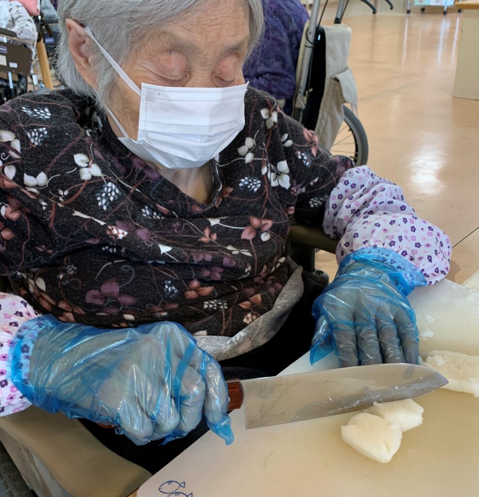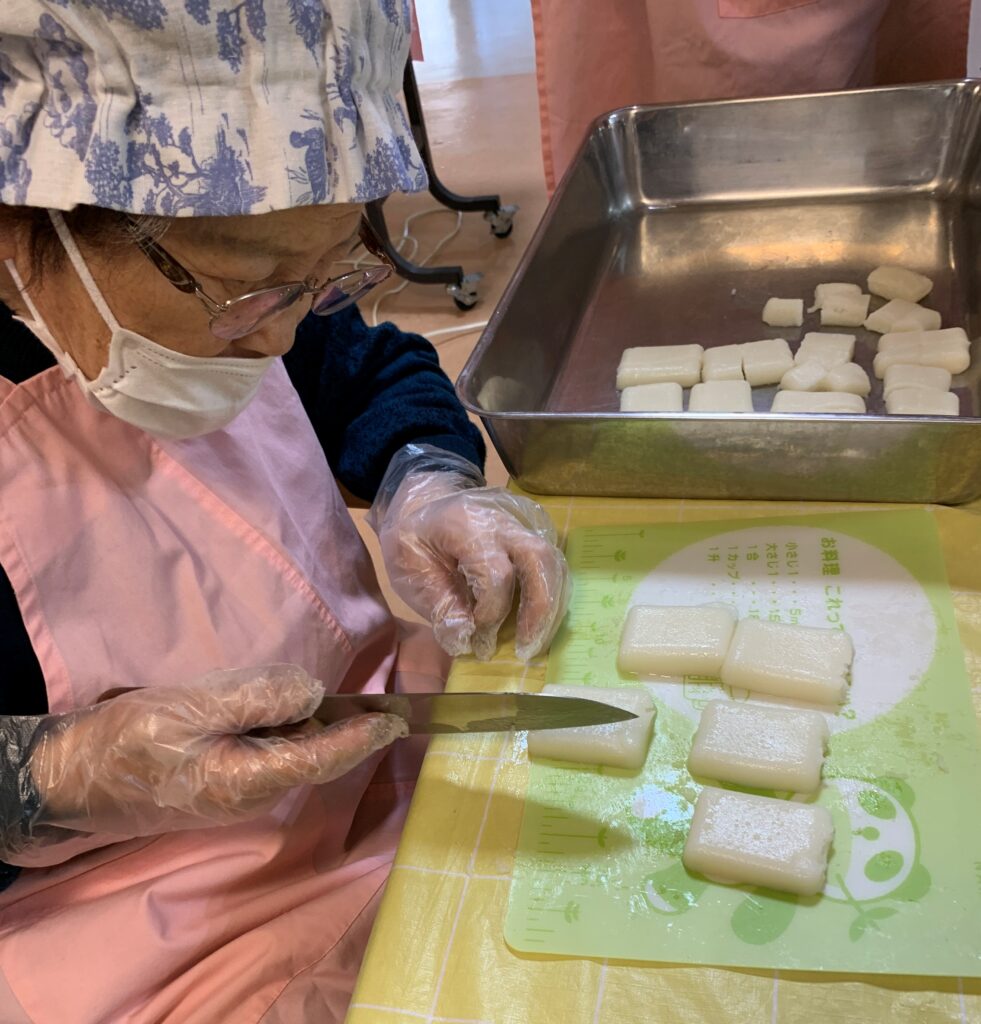 こし餡とつぶ餡、砂糖と塩少々を鍋に加えてぜんざいを煮込んでいる間、利用者さんには包丁を使ってお餅風ムースを切ってもらいました。