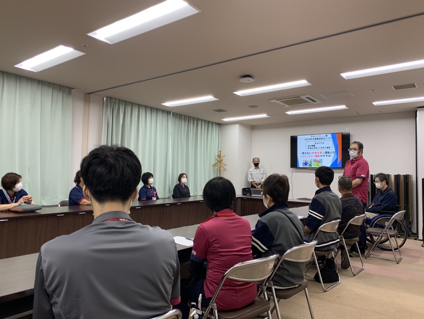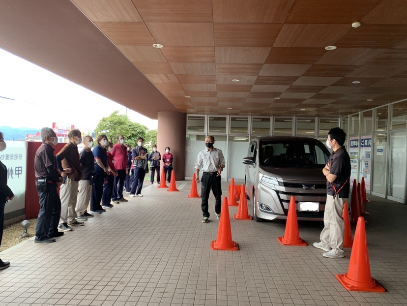 車の死角や運転時の危険予測などについて学びました。思った以上に運転席から見える範囲が狭くて驚きました。今回の気づきを忘れずに、運転時に潜む危険を予測しながら車輌事故ゼロに努めます。日々安全運転を心がけながら利用者の皆様の在宅生活を支援していきます。