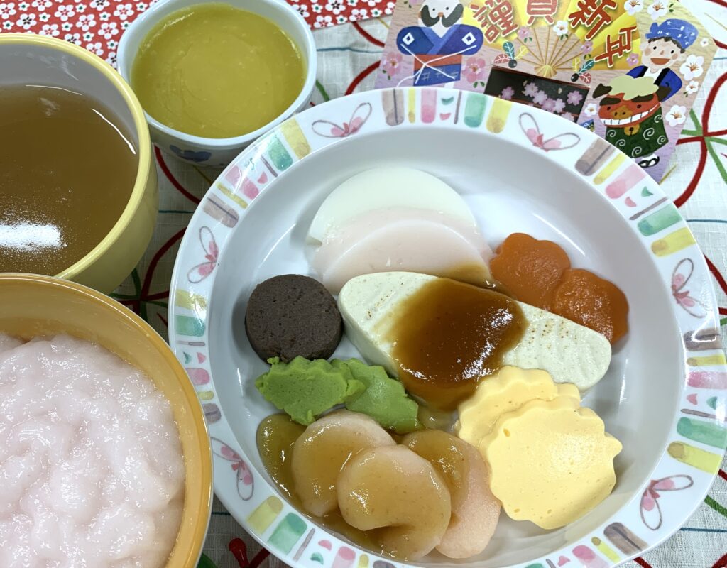 嚥下食メニュー:御赤飯風粥・鰆の味噌焼き・伊達巻風卵・海老と野菜の旨煮・紅白かまぼこ・きんとん等