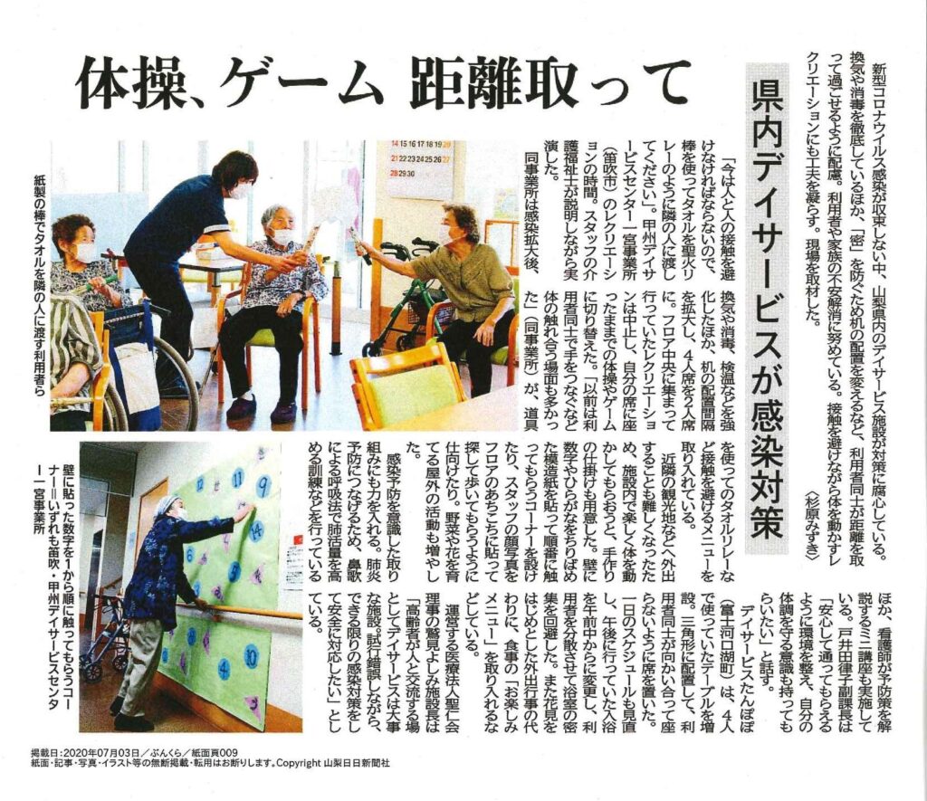新型コロナウイルス感染が収束しない中、高齢者の健康と生活を維持するデイサービス事業は、「密」を防ぎながら、しっかりと体を動かして利用者さんの交流をはかることが必要です。一宮事業所では、看護師、リハビリスタッフ、介護福祉士それぞれが専門的な立場で工夫を行っており、その様子が7月3日の山梨日日新聞に掲載されました。