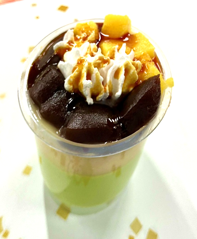 和風パフェには抹茶ババロアときなこムースを重ね、利用者さんに大人気の餡子、ホイップクリーム、さつまいもムースを彩りよくトッピング。