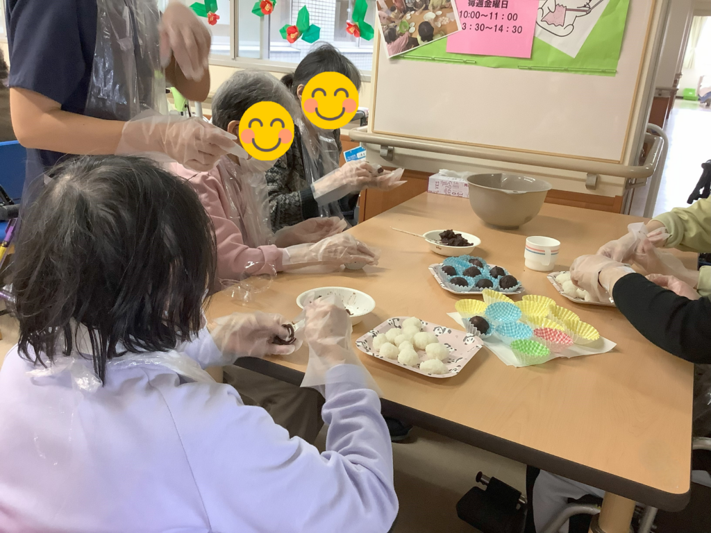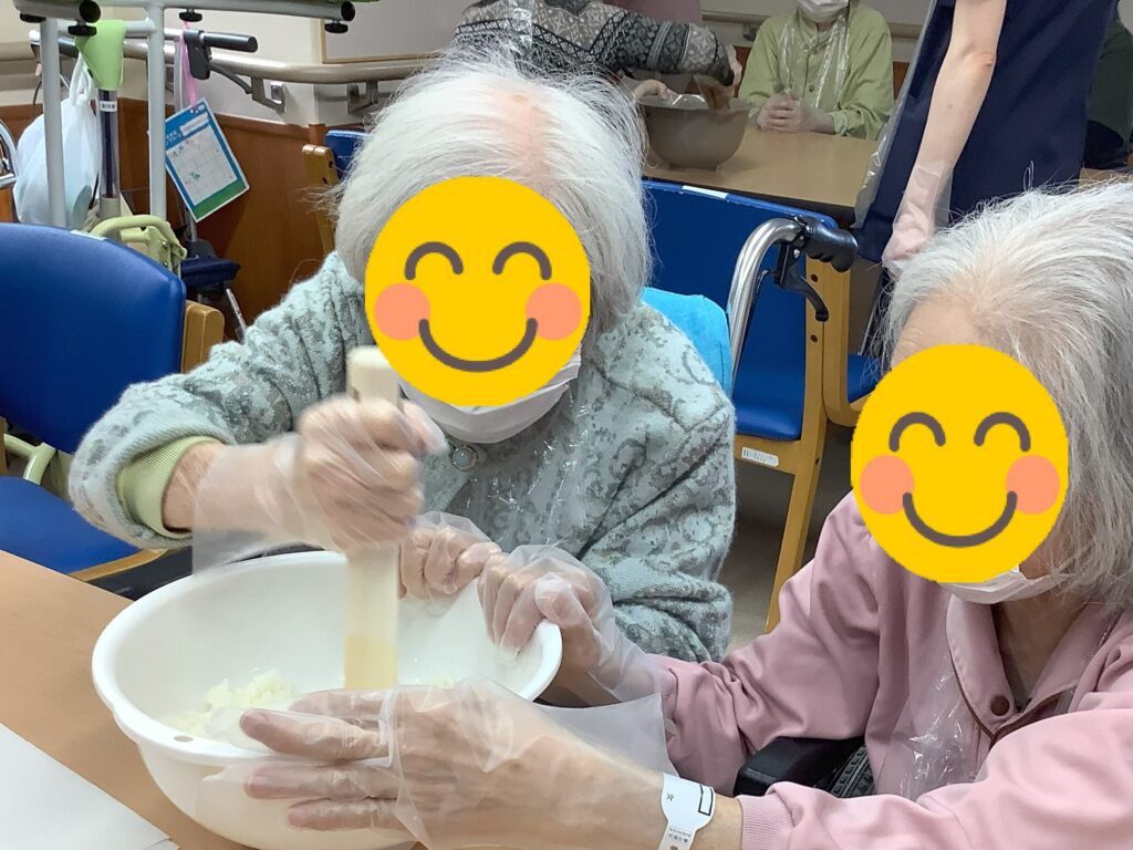 毎日の院内デイに加え、調理クラブは毎月1回の活動です。おむすび作りやおはぎ作り、スイートポテト、チョコバナナ、味噌汁作りなど材料を切る・潰す・握る・混ぜるなどの家事動作を行っています。主婦歴が長い患者さんは、隣患者さんと協力したり、物を貸し出したりと、これが本来の姿なんだなあと感じさせられる場面が多く見られています。