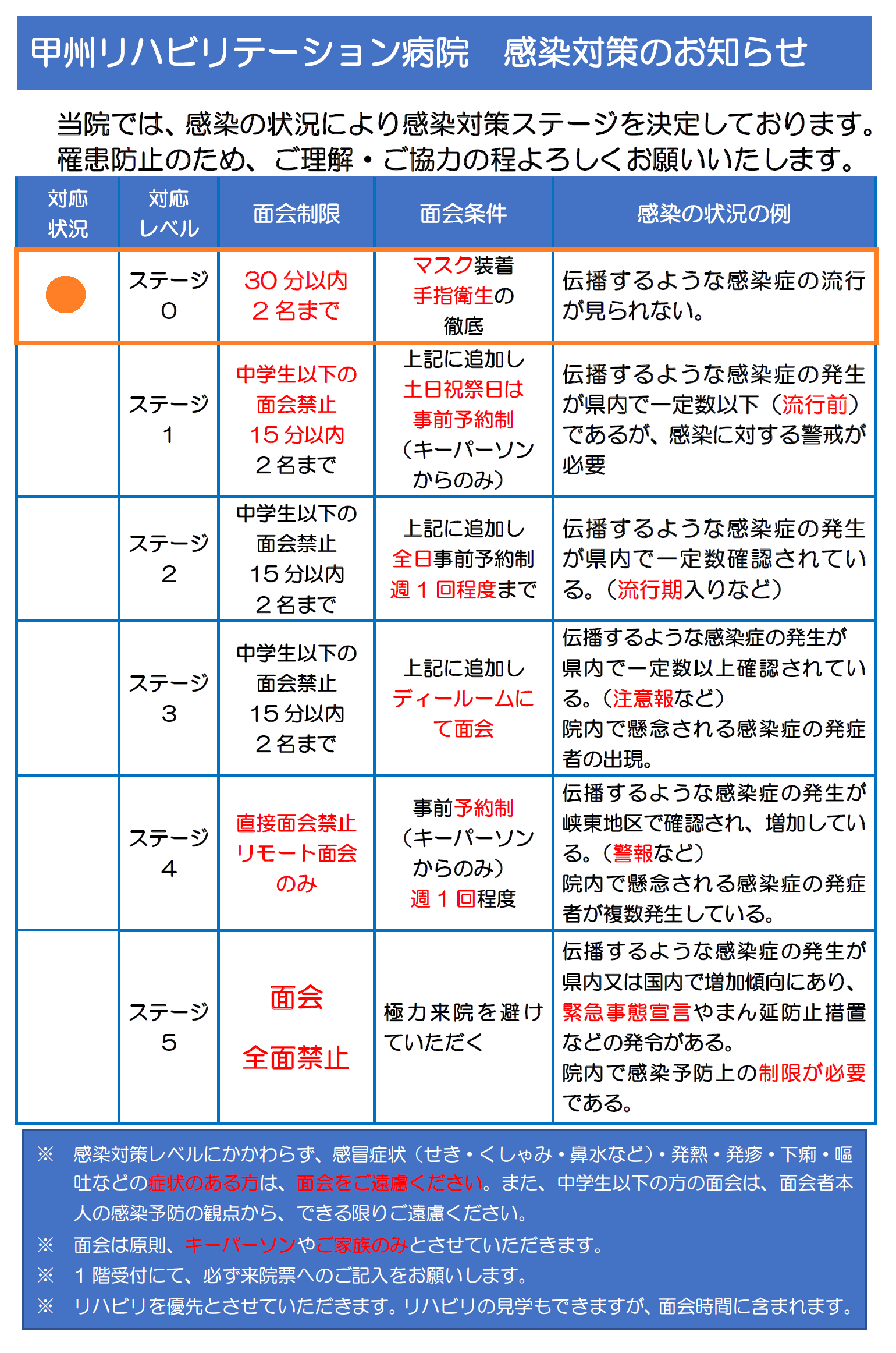 2024年10月21日より「ステージ1」から「ステージ0」へ変更し、面会についても