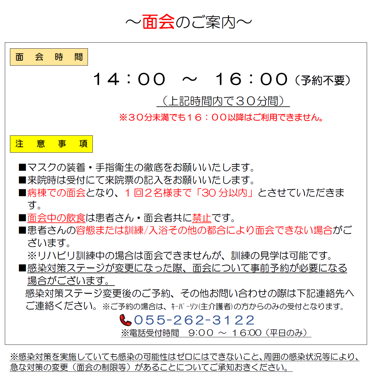 当院では、感染状況に合わせた「感染対策ステージ」により面会方法を変更しております。