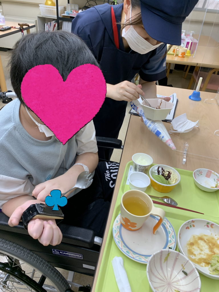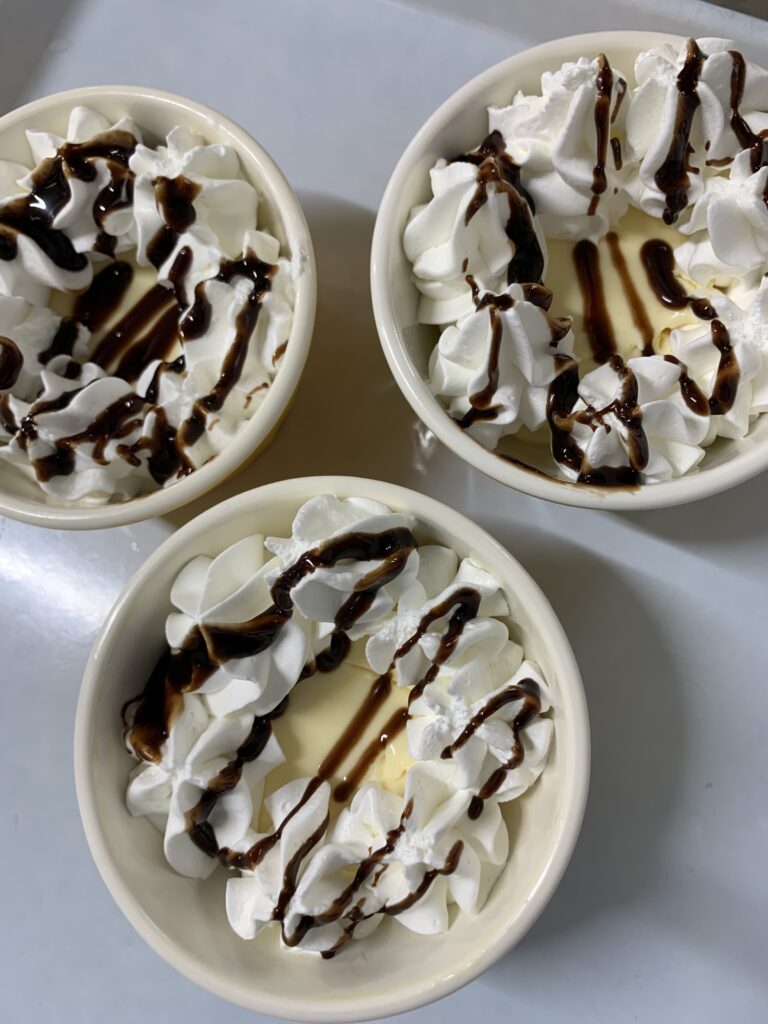 嚥下障害のある患者さんへは、冷たい‘‘溶けないアイス風‘‘にホイップクリームとチョコソースで可愛らしく盛り付けを行い「冷たいものが食べられて嬉しい」と好評でした。