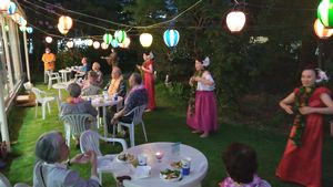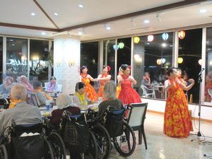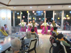 8月19日(金)ミニビアガーデンを4年ぶりに開催しました。メインイベントは今年も「フラダンス教室」でお世話になっているEmiフラスタジオ「Moana Nani」の皆様です。本格的なフラダンスをはじめ、聞きなれた曲でのダンスの披露に、入居者様もお楽しみ頂けたようです。お酒とおつまみと楽しいひと時を過ごしていただきました。