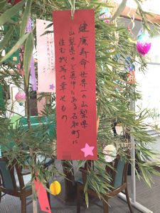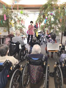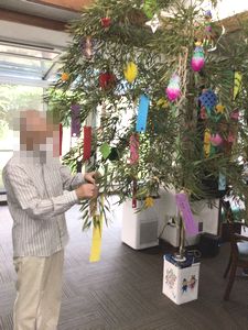 ラウンジに笹を飾り、七夕のイベントを行いました。 それぞれの思いが込められた短冊や、折り紙で作成した飾りを入居者の皆様と一緒に飾り付けました。