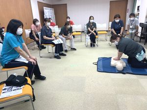 外部から講師を招き、AEDの学習会を行いました。 人形を使って実際に「意識確認・声掛け → 協力要請・119番通報 → 呼吸確認・胸骨圧迫 → AEDの使用」と実践研修しました。 【いざ】という時に冷静に行動する事が出来るように職員全員で勉強をしていきたいと思います。